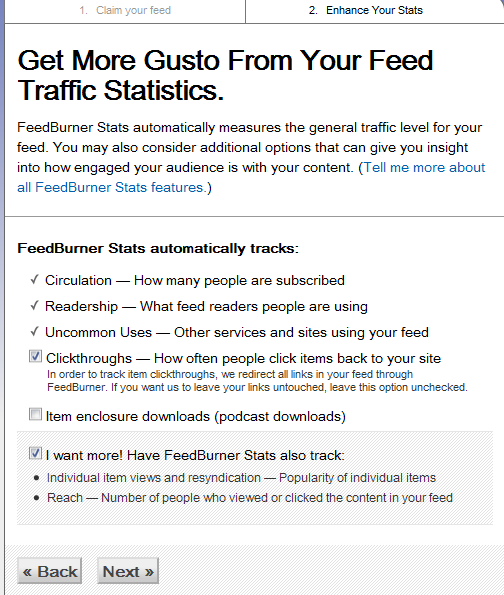 So, I check Clickthroughs and Feedburner stats, Then Next.